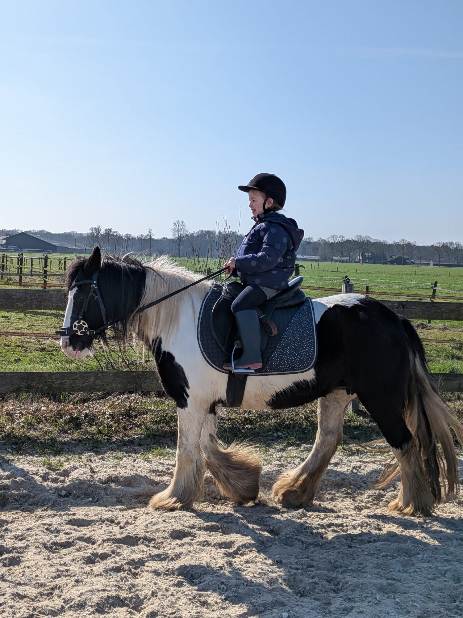 De ponygroep is voor alle jongens en meisjes die het leuk vinden om met paarden en pony’s bezig te zijn. Je leert in deze groep hoe je met paarden kunt omgaan, hoe je ze kunt poetsen, opzadelen en berijden. Maar we doen soms ook andere dingen. Wat dacht je van ‘kunstjes op het paard’? Of het paard aan een lang touw rondjes om je heen laten lopen, een rit maken in de kar met boer Dick en zijn paard Wendy, manen vlechten of de staart van het paard wassen.